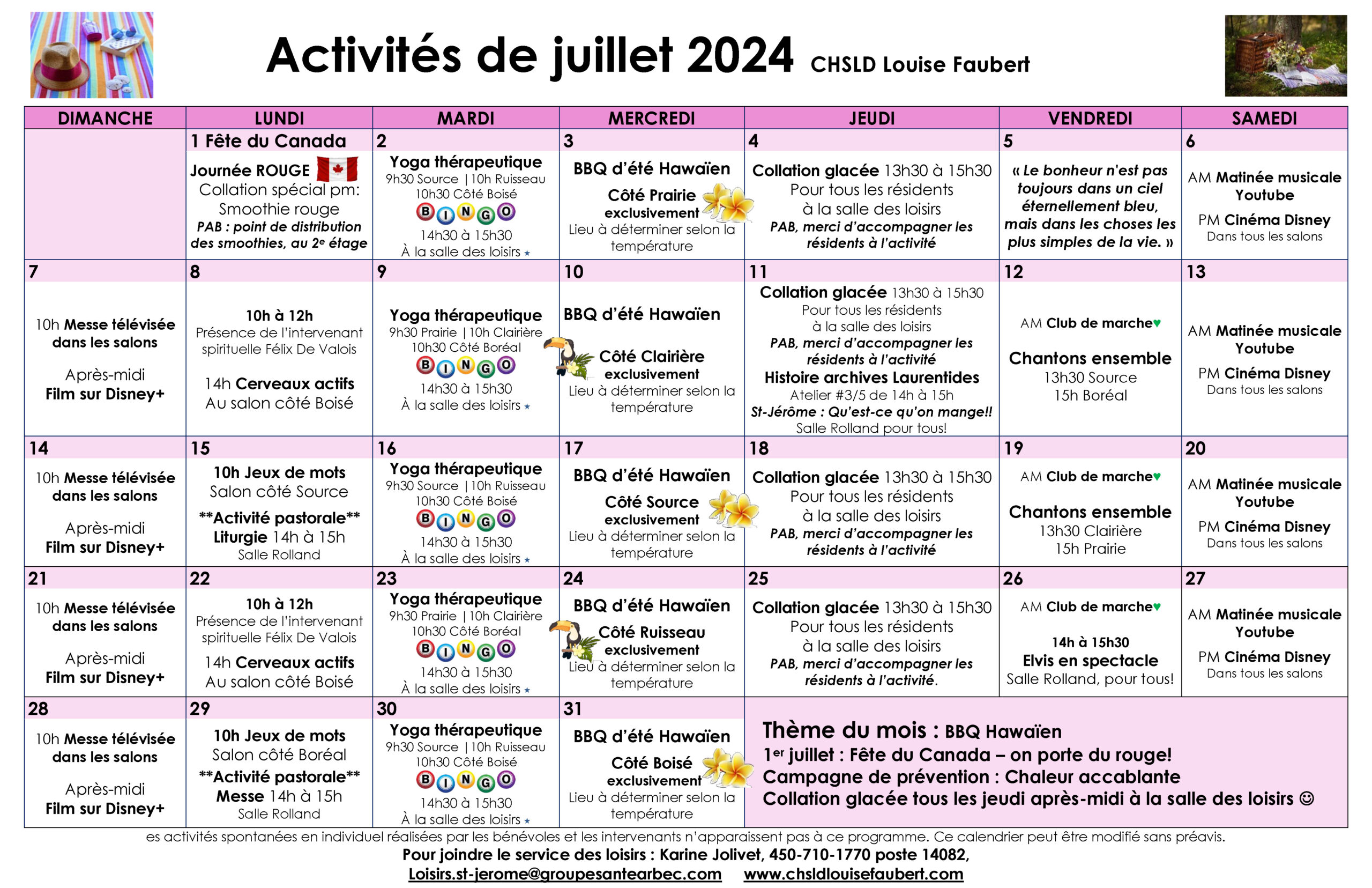 Calendrier des loisirs du mois de juillet 2024 pour les résidents du CHSLD Louise-Faubert